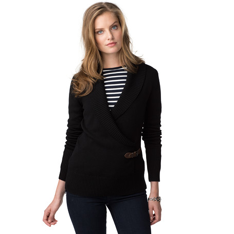 Beautiful jersey with a very stylish wide collar that extends to the bottom edge. Very warm fabric blend of soft cashmere wool and nylon. Highlights of double leather buckle at the waist. Ribbed collar and wide ribbed seams also in sleeves and bottom. Flag Tommy Hilfiger on the left sleeve.