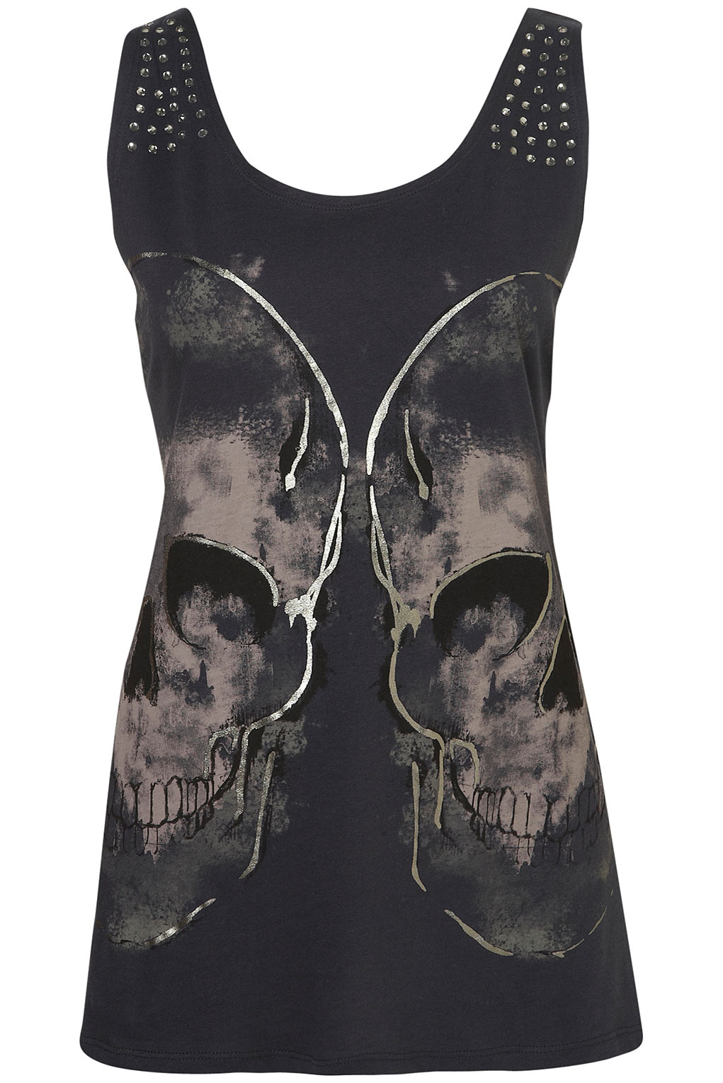 Black vest with mirror skull motif and gems at shoulders 100% Cotton. Machine washable.